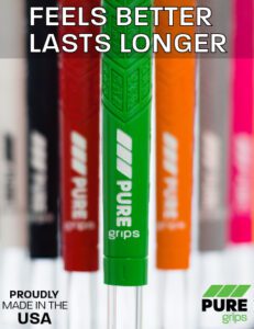 PURE OVERSIZE PUTTER GRIP …. Quite simply a “great feeling”putter grip and a lot of people say putting is all about “feel”. A unique product with softness and tackiness unmatched in any other putter grip that makes for less grip pressure and better putting performance.